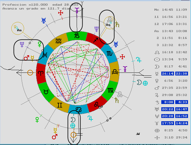 Creo que está claro… primero que nada la conjunción de Urano (planeta que viene desde la 8ª) con el Sol, la alteración de los nervios, luego vemos al Sol conjunción Saturno, y aparece nuevamente Saturno involucrado, el Infortunio llegando a la conjunción Marte-Mercurio presentes en la 12ª, y vemos a Venus presente en Piscis, en buen estado cósmico que conjunta por atacir a Júpiter su dueño, presente en 4ª pero además esta misma Venus está activada por el Descendente.