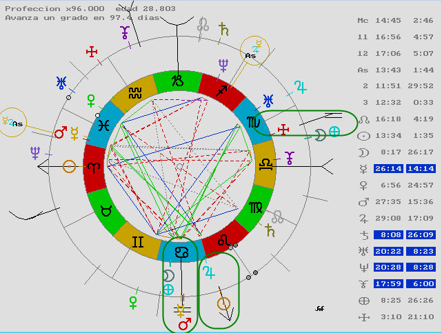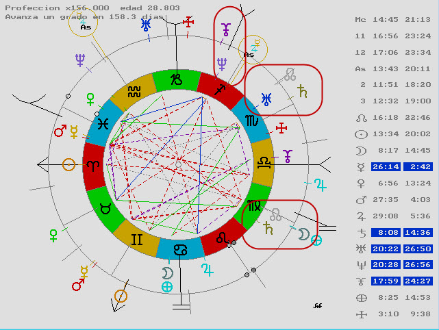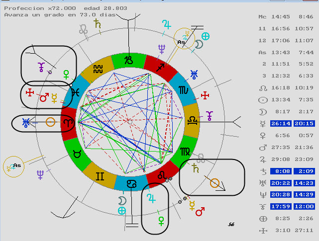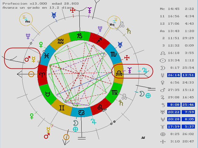 Aquí vemos a Júpiter regente de casa 12 llegando a Plutón regente de la casa 8, pero además el Medio Cielo acaba de hacer la conjunción con Marte también regente de la 8ª casa y del Sol.