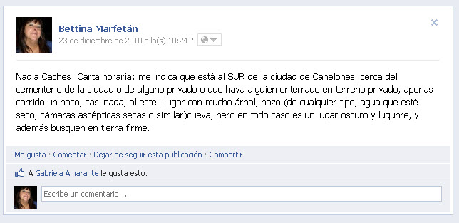 Esto fue lo que envié el día 23 de diciembre de 2010 a uno de los grupos de búsqueda de Nadia Caches.